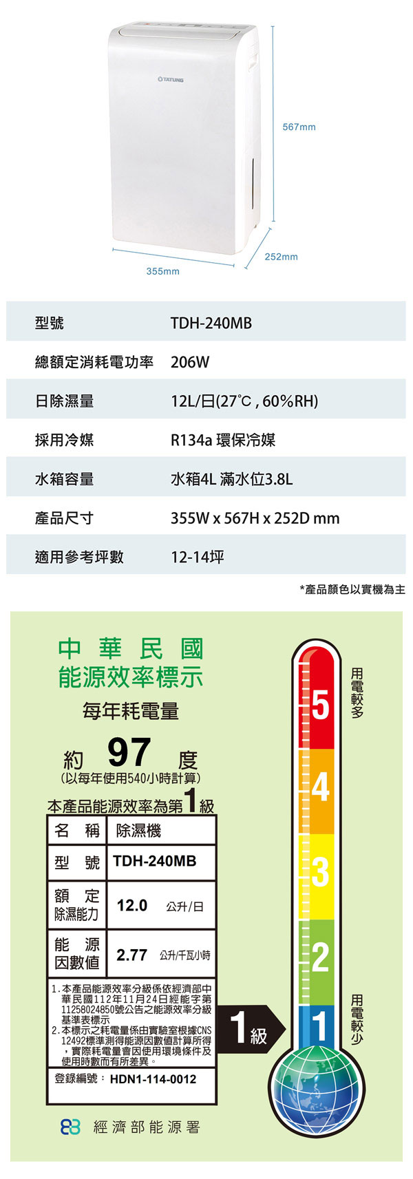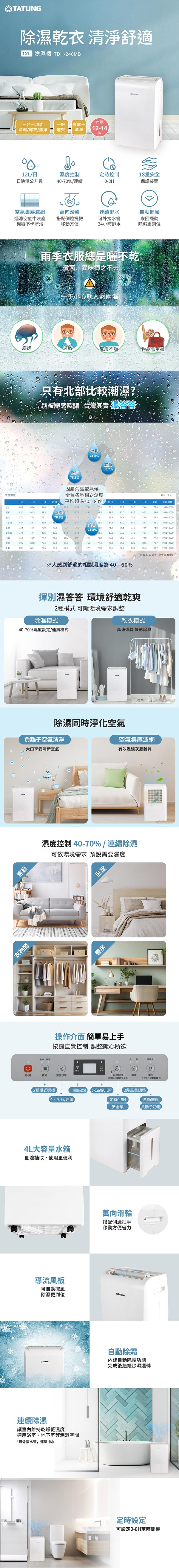 TATUNG大同 12公升 適用12~14坪 TDH-240MB 一級能效大同除濕機 三合一功能 ★對抗濕冷★